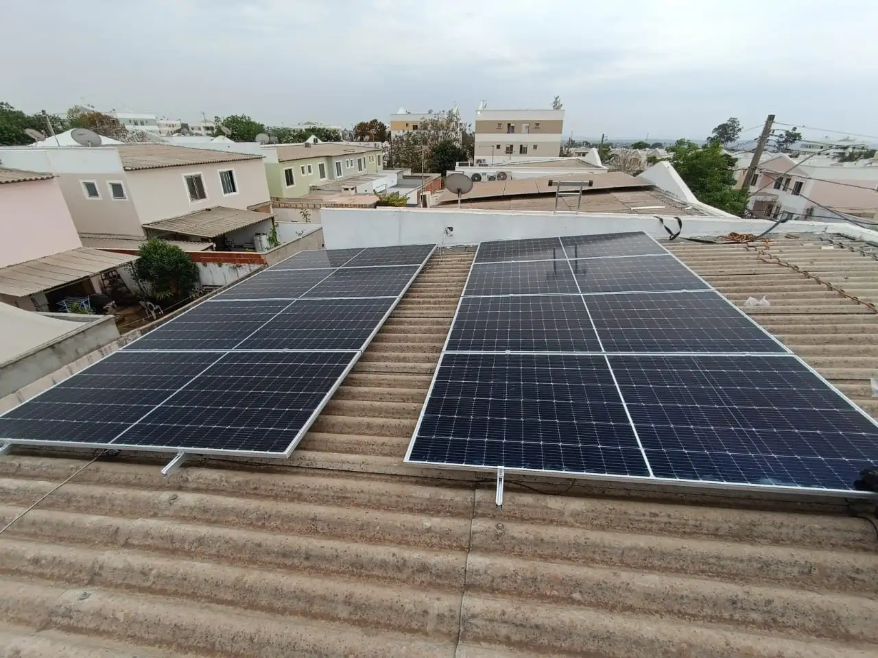 Instalação de 8 módulos fotovoltaicos dimensionados para uma geração média estimada de 600 kWh por mês, ideal para atender comércios, empresas ou unidades com alto consumo de energia elétrico.